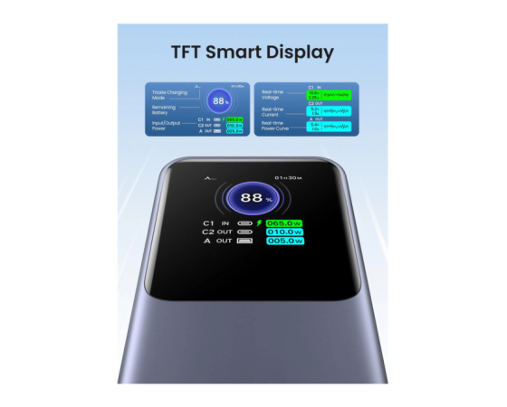 Zagotovite si pametnejšo izkušnjo polnjenja prek vrhunskega digitalnega zaslona, ki prikazuje preostalo baterijo, napetost v realnem času, tok v realnem času, vhodno moč in izhodno moč. Hitro in intuitivno lahko razumete stanje napolnjenosti različnih naprav.