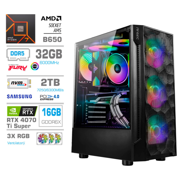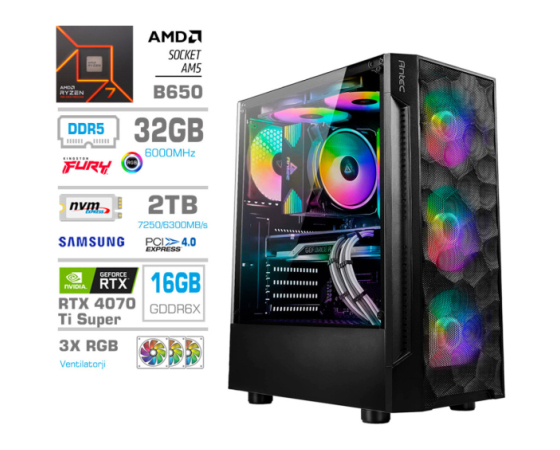MEGA S7 AMD gaming računalnik temelji na sodobnih B650 in B850 čipsetih, ki predstavljajo najboljšo vrednost v AMD ekosistemu. Ti čipseti nudijo odlično podporo za najnovejše Ryzen procesorje, DDR5 pomnilnik in PCIe 5.0, kar pomeni, da je ta gaming računalnik pripravljen tudi na prihodnje tehnologije.