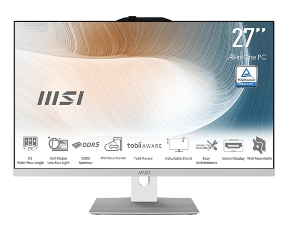 MSI Modern AM272P 1M je eleganten 27-palčni All-in-One računalnik, zasnovan za sodobna delovna okolja, kjer sta pomembna urejen delovni prostor in zanesljivo delovanje. Združuje računalnik in monitor v eni napravi, kar zmanjšuje količino kablov in omogoča bolj organizirano delovno okolje v pisarni, na recepciji ali v domači pisarni.