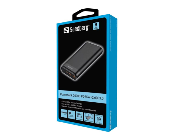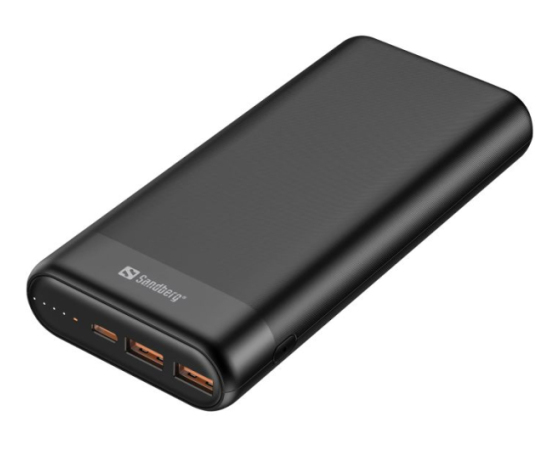 Sandberg Powerbank 20000 mAh PD65W+2xQC3.0 prenosna baterija predstavlja visoko hitrost, izjemno delovanje in ogromno zmogljivost. Ko ste stran od električne vtičnice, vam ta prenosna baterija zagotovi optimalno polnjenje vsake mobilne naprave. Podpira standarde USB-A, QC 3.0 in USB-C PD 65W. Zadnji omogoča polnjenje skoraj vsake naprave USB-C (vključno s prenosnimi računalniki) pri maksimalni hitrosti.