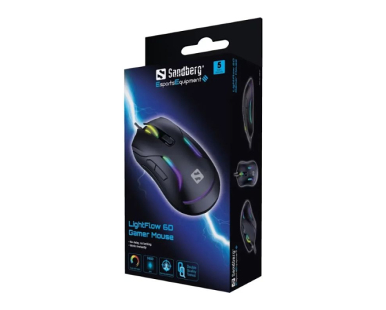 Sandberg LightFlow 6D Gamer Mouse je učinkovita miška za igralce in uporabnike, ki želijo odzivnost in prilagodljivost. Omogoča nastavitve DPI vrednosti 1200, 1800, 2400 in 3600, ima senzor modela 603EP in stikalno tehnologijo Huano. Gumbi so ocenjeni na 3 milijone klikov, kar zagotavlja dolgo življenjsko dobo. Pleteni 1,5‑metrI kabel zagotavlja zanesljiv prenos podatkov in manj nenamernih poškodb kabla. RGB osvetlitev samodejno izmenjuje sedem barv, kar daje miški vizualno privlačnost. Miška je takoj pripravljena za uporabo (plug‑and‑play) brez dodatnih gonilnikov in je združljiva z Windows in macOS sistemi.