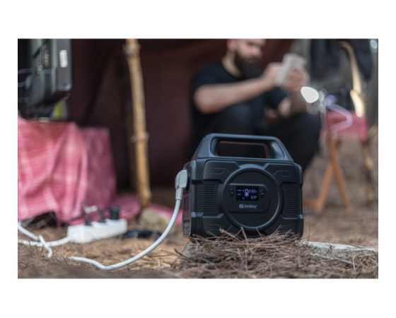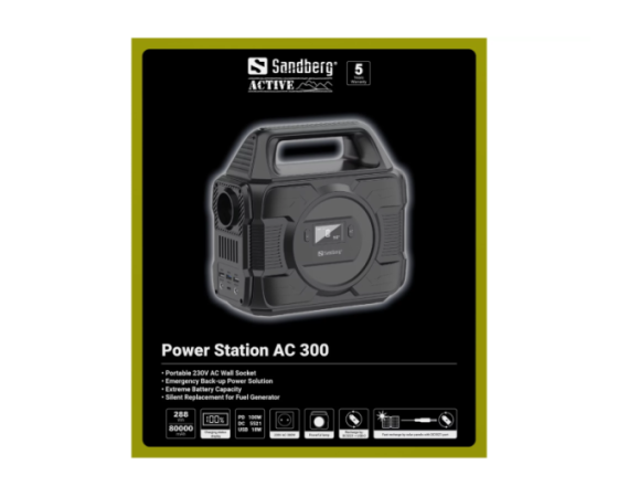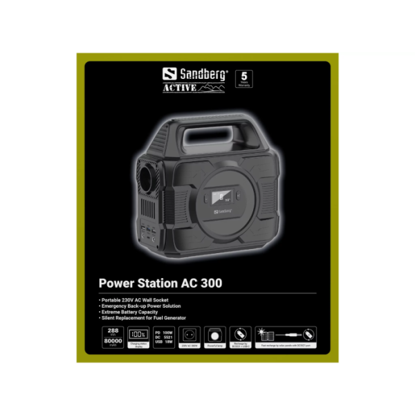 Sandberg Power Station 300 AC omogoča zanesljivo napajanje različnih naprav tudi tam, kjer ni dostopa do električnega omrežja. Vgrajena baterija visoke kapacitete zagotavlja dovolj energije za prenosnike, telefone, manjše gospodinjske naprave in drugo elektroniko. Naprava vključuje klasično AC vtičnico za priklop standardnih naprav ter več USB izhodov za neposredno polnjenje mobilnih naprav.