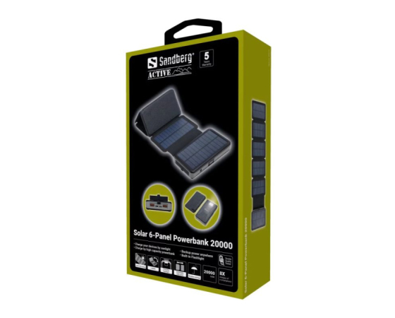 Podatki o pakiranju: 1x Sandberg Solar 6-Panel Powerbank 20000 mAh, 1x karabin, 1x USB-A na USB-C kabel (30 cm), 1x navodila za uporabo