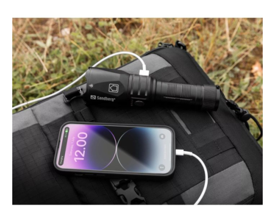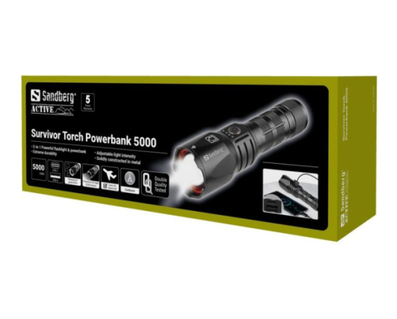 Sandberg Survivor Torch Powerbank 5000 svetilka s prenosno baterijo je popolna oprema za pustolovščine, odprave in taborjenje. Močna vgrajena baterija zagotavlja dolgotrajno močno svetlobo in možnost opozorilnih bliskov, ki trajajo več ur. Ob strani svetilke je vhod USB, ki vam omogoča polnjenje pametnega telefona. Izjemno robustna zasnova je zaslužna, da bo svetilka prenesla tudi zahtevna okolja. Snop svetlobe lahko po potrebi prilagodite. Svetilko lahko uporabite tudi kot zasilno kladivo.