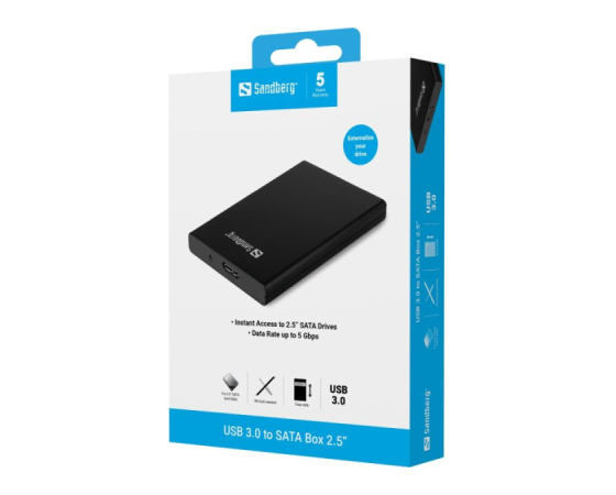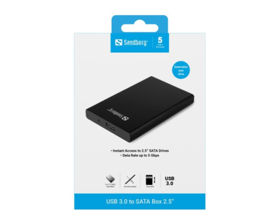 Sandberg USB 3.0 v SATA Box 2.5'' ohišje vam omogoča povezavo zunanjega trdega diska SATA z vašim računalnikom. Trdi disk brez težav in hitro namestite v ohišje, posledično ga lahko začnete uporabljate v parih minutah.