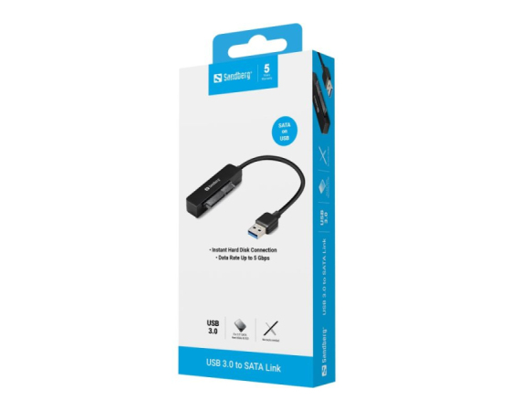 Sandberg USB 3.0 v SATA Link vmesnik vam omogoča, da z računalnikom povežete 2.5” SATA trdi disk. Povezava preko USB 3.0 omogoča doseganje impresivnih hitrosti prenosa podatkov do 5 Gbit/sekundo. To je idealno, zlasti ko želite prenesti velike količine podatkov in izvajati redno varnostno kopiranje.
