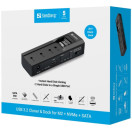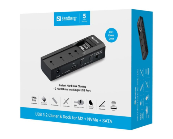 Sandberg USB 3.2 Cloner & Dock za M2 + NVMe + SATA, USB-C > USB-A/C kabel v dolžini 80 cm, napajalnik z vhodom 230V AC in izhodom DC 12V/3A (EU priključek), navodila za uporabo