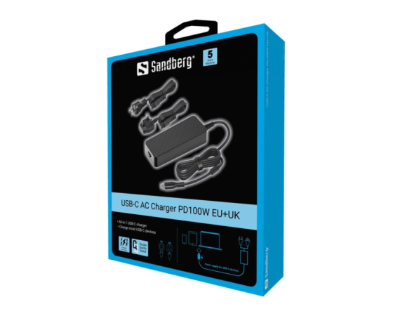 Podatki o pakiranju: 1x Sandberg USB-C AC Charger PD100W EU+UK, 1x EU napajalni kabel, 0,8 metra, 1x UK napajalni kabel, 0,8 metra