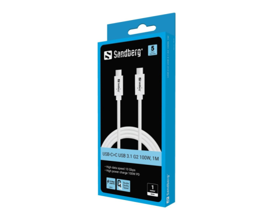 Sandberg USB-C > C USB 3.2 Gen2 PD 100W 5m polnilni kabel podpira hitrosti prenosa podatkov do 10 Gbps. Prenašajte velike datoteke, pretakajte video posnetke ali sinhronizirajte svoje naprave pri visokih hitrostih. Podpira polnjenje PD do 100 W.