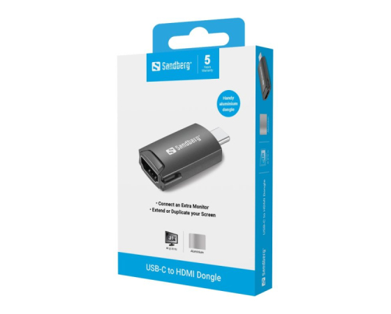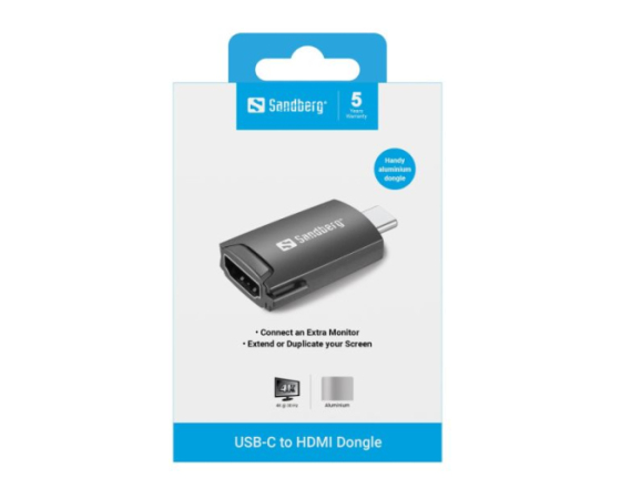 S Sandberg USB-C v HDMI Dongle vmesnikom lahko preko vhoda USB-C na svoj računalnik priključite drugi monitor, televizor ali projektor.