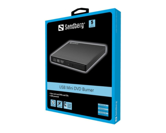Sandberg USB DVD Drive zunanji zapisovalnik omogoča zapisovanje in branje CD in DVD medijev. Ta zapisovalnik je popolni dodatek za računalnik brez pogona za CD ali zapisovalnika za DVD medije. Zapisovalnik se napaja preko vhoda USB računalnika, zato ga lahko uporabljate tudi na poti, brez potrebe po iskanju vtičnice. Dobro pa se obnese tudi kot predvajalnik vaših DVD-jev na prenosniku. Uporabljate ga lahko takoj, saj ne potrebuje nobene posebne programske opreme.