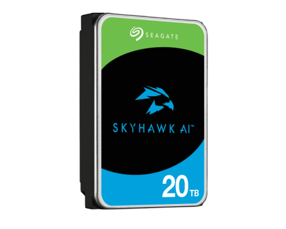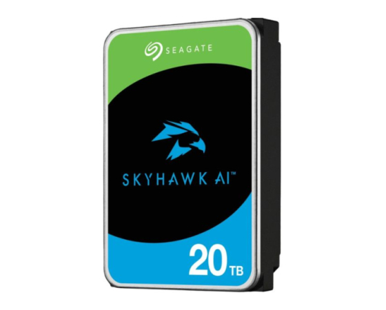 Seagate SkyHawk AI (ST20000VE003) je zmogljiv 3,5-palčni notranji disk s kapaciteto 20 TB, namenjen profesionalnim video nadzornim sistemom, vključno z AI analitiko. Povezuje se prek SATA 6 Gb/s in uporablja tehnologijo CMR ter helično ohišje za učinkovito delovanje 24/7 z letno obremenitvijo do 550 TB. Disk podpira do 64 HD kamer in 32 AI tokov, zahvaljujoč naprednim senzorjem AO (RV) ter ImagePerfect AI firmwaru, kar zagotavlja nemoten video brez izgube posameznih okvirjev. Vključena je tudi zaščita podatkov z SkyHawk Health Management sistemom. Združljiv je z NVR/DVR rešitvami, QNAP in Synology, ter drugimi vodilnimi platformami.