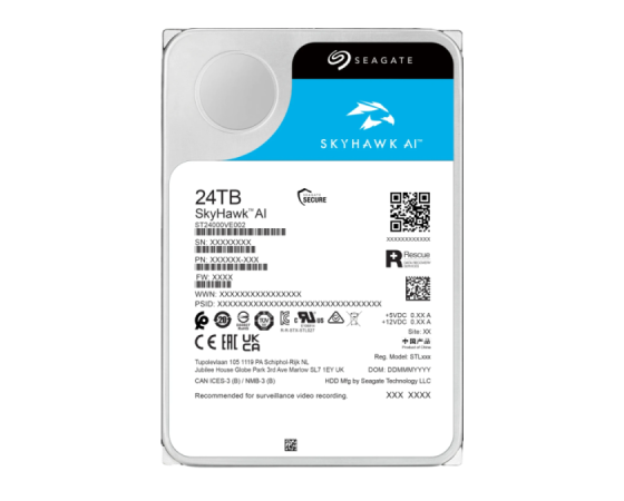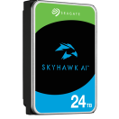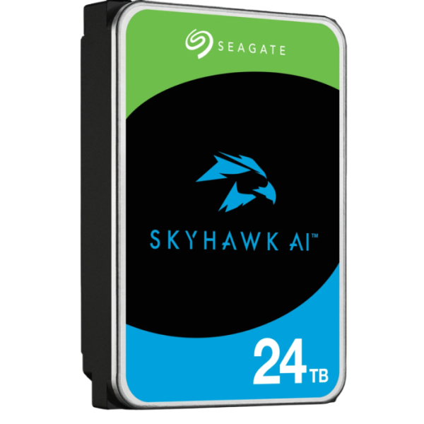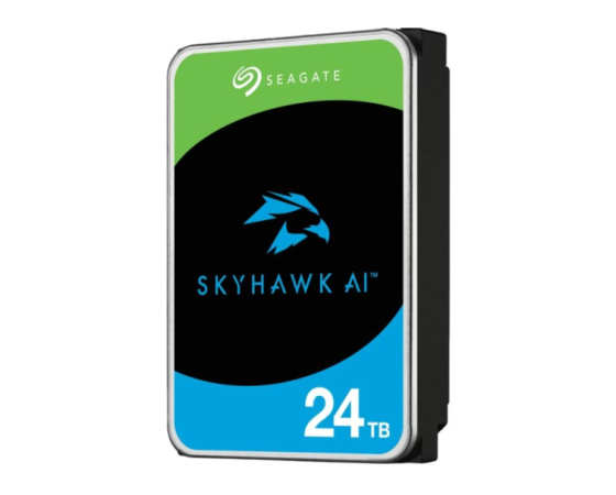 Seagate SkyHawk AI (ST24000VE002) je zmogljiv 3,5-palčni notranji disk s kapaciteto 24 TB, namenjen profesionalnim video nadzornim sistemom, vključno z AI analitiko. Povezuje se prek SATA 6 Gb/s in uporablja tehnologijo CMR ter helično ohišje za učinkovito delovanje 24/7 z letno obremenitvijo do 550 TB. Disk podpira do 64 HD kamer in 32 AI tokov, zahvaljujoč naprednim senzorjem AO (RV) ter ImagePerfect AI firmwaru, kar zagotavlja nemoten video brez izgube posameznih okvirjev. Vključena je tudi zaščita podatkov z SkyHawk Health Management sistemom. Združljiv je z NVR/DVR rešitvami, QNAP in Synology, ter drugimi vodilnimi platformami.