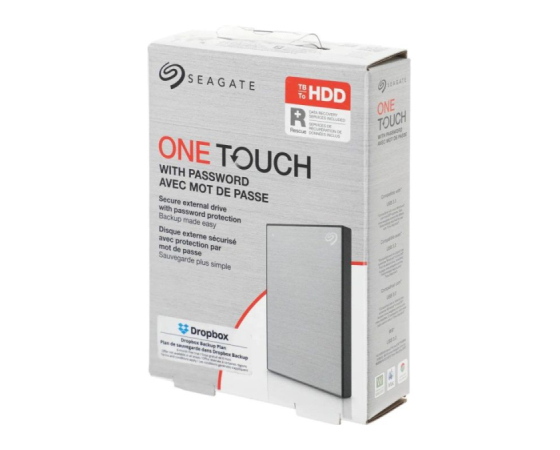 Seagate One Touch (STKZ5000401) je robusten 5 TB USB 3.0 zunanji disk s kovinsko ohišje in strojno šifrirano zaščito z geslom. Ponuja sekvenčno prenosno hitrost do 130 MB/s in deluje brez namestitve programske opreme. Naprava vključuje funkcijo samodejnega varnostnega kopiranja prek orodja Toolkit, Rescue Data Recovery, leto dni naročnine Mylo Create in štirimesečno naročnino Adobe Creative Cloud Photography. Združljiv je z operacijskimi sistemi Windows, macOS in Chrome OS, brez potrebe po preformatiranju.