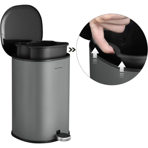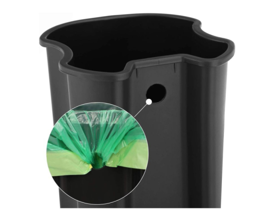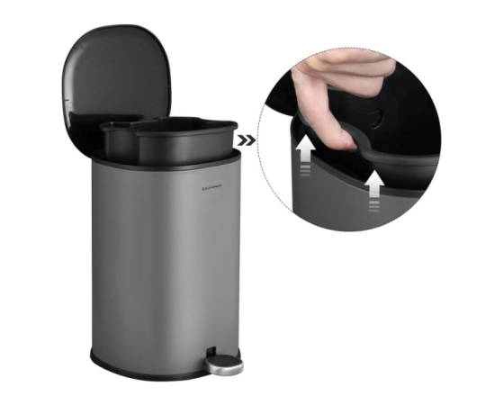 Ta 5-litrski koš ima premišljeno obliko z odstranljivo notranjo posodo, ki jo je enostavno očistiti. Odprtina na zadnji strani notranje posode preprečuje drsenje vrečke. Zunanji ročaj omogoča enostavno prenašanje brez dotika površine koša.