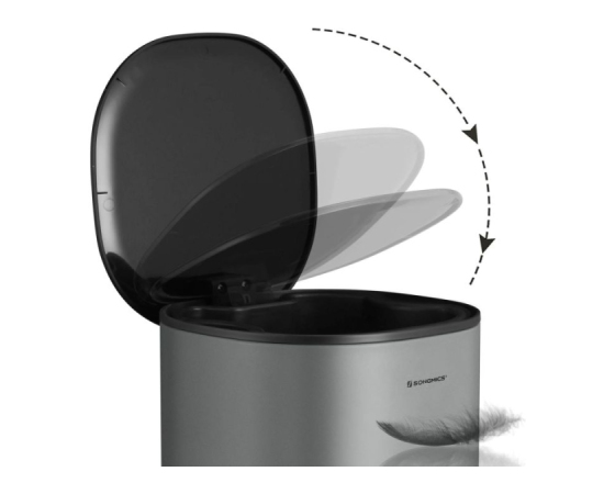[Nežen zapiralni mehanizem]: Čeprav ima trpežno kovinsko zunanjost, ta koš ohranja mehkobo. Mehanizem omogoča tiho, počasno in nežno zapiranje pokrova, kar zagotavlja prijetno uporabo.