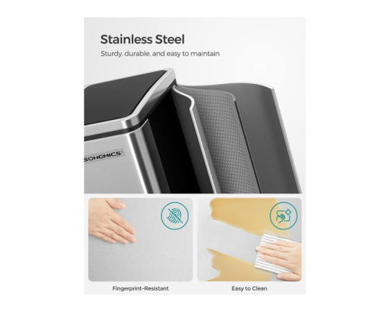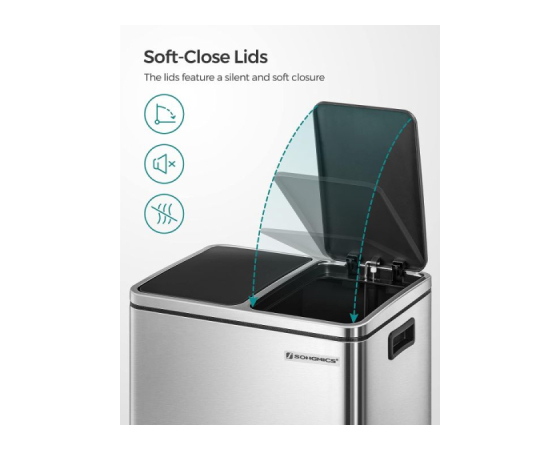 Ima mehko stran: Čeprav je izdelan s togo kovinsko zunanjostjo, je koš za odpadke nežen - zaradi blažilnega mehanizma se pokrovi zapirajo mehko, počasi in neslišno, kar preprečuje nastanek neprijetnih vonjav brez glasnega brnenja