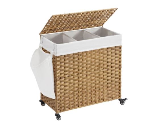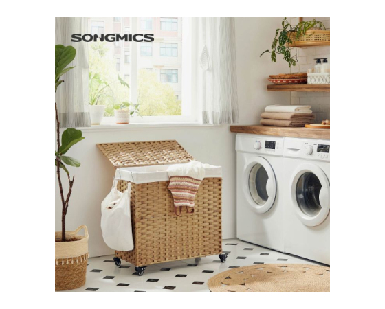 SONGMICS koš za perilo, ročno tkani koš za perilo, 140-litrski koš za perilo iz ratana s 3 predali, odstranljiva podloga, ročaji, pokrov, dnevna soba, kopalnica, 66 x 33 x 60 cm, naravni LCB363N01