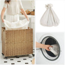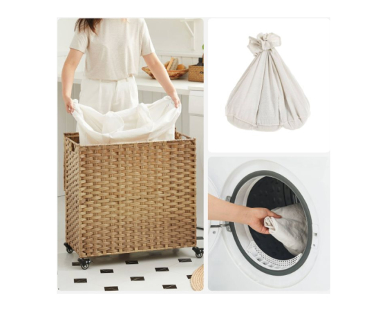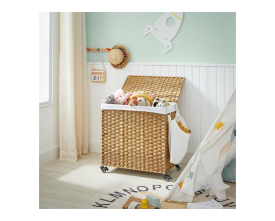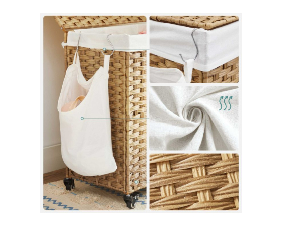 Koš za perilo ima 4 kolesa (4 imajo zavore), zato ga lahko premikate ali po potrebi držite na mestu, kolesa pa lahko zamenjate tudi z nogami; za premikanje je vključen tudi dolg pasni ročaj