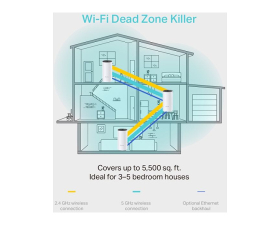 | Advanced Functions | ● Router/ Access Point Mode ● Optional Ethernet Backhaul ● Guest network ● TP-Link Mesh Technology: MU-MIMO Auto Path Selection Self-Healing AP Steering Band Steering Beamforming |