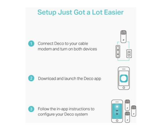 | Package Contents | ● Deco M4 (3-pack): 3 Deco units 1 RJ45 Ethernet Cable 3 power adapters 1 quick installation guide ● Deco M4 (2-pack): 2 Deco units 1 RJ45 Ethernet Cable 2 power adapters 1 quick installation guide ● Deco M4 (1-pack): 1 Deco unit 1 RJ45 Ethernet Cable 1 power adapter 1 quick installation guide |