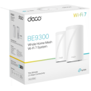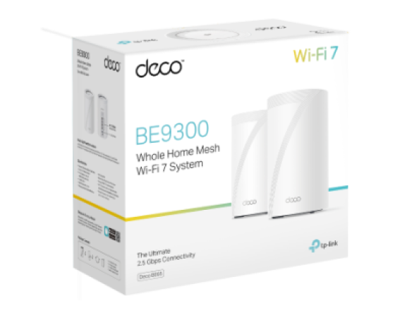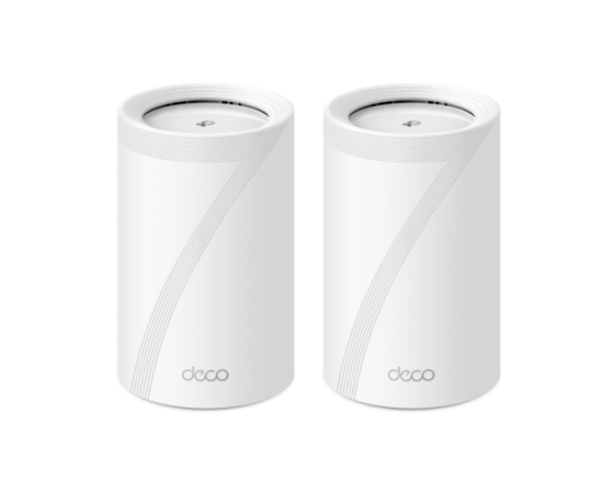 Deco BE65 (2-pack) je tri-pasovni Wi-Fi 7 mesh sistem, zasnovan za visoko zmogljivost in razširjeno pokritost v celotnem domu. Sistem uporablja najnovejši standard Wi-Fi 7 in podpira hitrosti do 5765 Mbps v 6 GHz pasu, 2882 Mbps v 5 GHz pasu ter 688 Mbps v 2,4 GHz pasu. Integrirane štiri notranje visokozmogljive antene ter uporaba TP-Link Mesh tehnologije omogočajo stabilno in neprekinjeno pokritost z možnostjo žične Ethernet backhaul povezave med vozlišči.