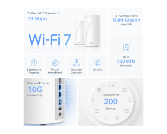 Izkusite vrhunski tripasovni sistem WiFi 7 Mesh za celoten dom z bliskovito hitrimi hitrostmi WiFi do 19 Gbps. Zdaj bo vsaka naprava v vašem domačem omrežju delovala z vrhunsko zmogljivostjo. Ekskluzivni 6 GHz pas zagotavlja izjemno pasovno širino in kanale brez preobremenitve, izključno za vaše naprave.