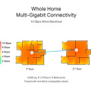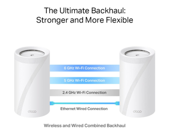 Z našo lastno razvito tehnologijo lahko Deco BE85 hkrati poveže brezžično in žično backhaul z vsako enoto. Še več, z najnovejšo tehnologijo WiFi 7 MLO se poveča pretok kombiniranega brezžič nega in žičnega backhaul omrežja sistema. Na ta način se močno izboljša skupna prepustnost in zmanjša zakasnitev, kar zagotavlja širšo pokritost s stabilnejšimi in zanesljivejšimi povezavami.