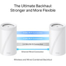 - Kombinirano brezžično in žično backhaul omrežje - Povezuje brezžično in žično backhaul (žična povezava med Deco enotami) omrežje z vsako enoto hkrati, da izboljš a splošno prepustnost in zmanjša zakasnitev.