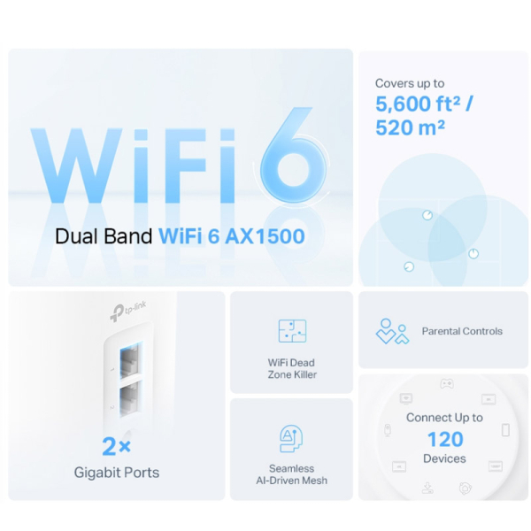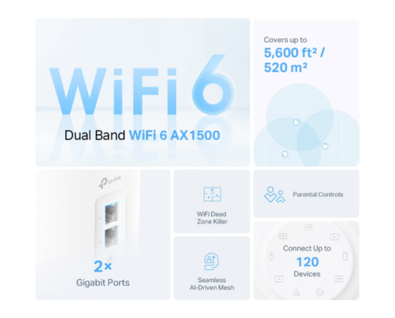 - Povečana brezhibna pokritost: Dosezite brezhibno pokritost celotnega doma z jasnejšim in močnejšim signalom Wi-Fi za celoten dom, ki ga ustvari Wi-Fi 6.