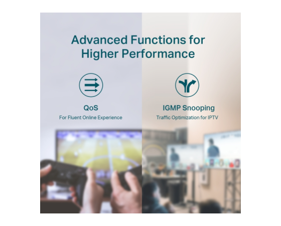 Funkcije: Združljiv z napravami PD, ki ustrezajo standardu IEEE 802.3af/at, Gumb za Extend način (priključki 1–4, do 250 m napajanja PoE in prenosa podatkov), Gumb za Priority način (priključki 1–4), Gumb za Isolation način (priključki 1–7 / 8–14), Samodejno PoE obnavljanje (priključki 1–16), Samodejno učenje in staranje MAC naslovov, Nadzor pretoka IEEE 802.3x, 802.1p/DSCP QoS, IGMP Snooping