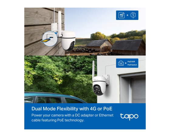 Tapo C501GW, podprt s TP-Linkovim strokovnim znanjem na področju 4G omrežij, se zanesljivo povezuje prek omrežij 4G LTE, kar je idealno za lokacije, kot so garaže, počitniške hiše, skladišča in kmetije, kjer stalen Wi-Fi ni na voljo. Preprosto vstavite 4G SIM kartico (ni priložena) za enostavno in brezskrbno nastavitev interneta.