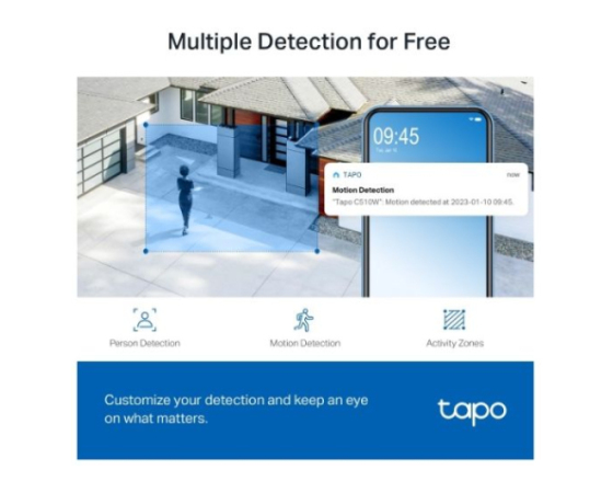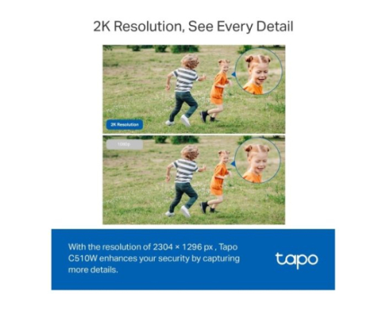 Ločljivost 2K - Z ločljivostjo 2304 × 1296 slikovnih pik Tapo C510W izboljša vašo varnost z zajemom več podrobnosti v primerjavi s tradicionalno ločljivostjo 1080p (1920 × 1080 slikovnih pik).