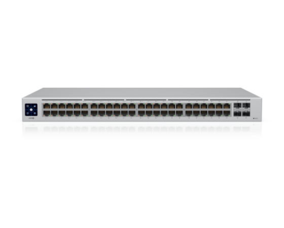 Stikalo 48 PoE (USW 48 PoE) je popolnoma upravljano stikalo z (48) vrati GbE RJ45, vključno z (32) vrati GbE, PoE+ in (4) vrati 1G SFP.