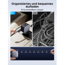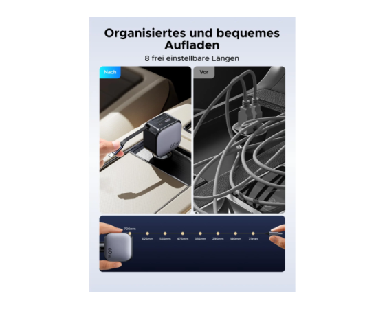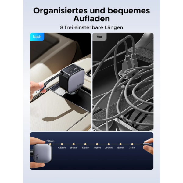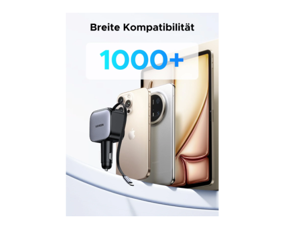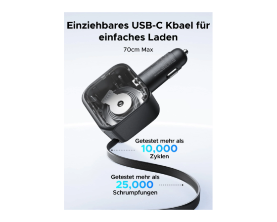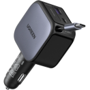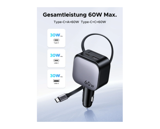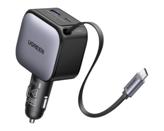 Model UGREEN 55212 prinaša visoko zmogljivost in praktičnost za uporabo v avtomobilu. Vgrajen izvlečni USB-C kabel dolžine do približno 0,7 m omogoča fleksibilno polnjenje mobilnih naprav na sovoznikovem ali zadnjem sedežu, brez zmešnjave kablov. Poleg njega polnilnik ponuja 1 × USB-C priključek in 1 × USB-A priključek, s katerima lahko hkrati polnite do tri naprave. Skupna izhodna moč znaša do 60 W, posamezno vrata pa omogočajo do 30 W izhodne moči. Podpora za številne protokole hitrega polnjenja (PD 3.0, PPS, QC 3.0/2.0, SCP, FCP, AFC in Apple 5 V/2.4 A) pomeni široko združljivost s telefoni, tablicami in drugimi napravami. Ohišje iz ognjeodpornega materiala in zaščitni sistemi pred prekomernim tokom, napetostjo in kratkim stikom zagotavljajo varno uporabo med vožnjo.