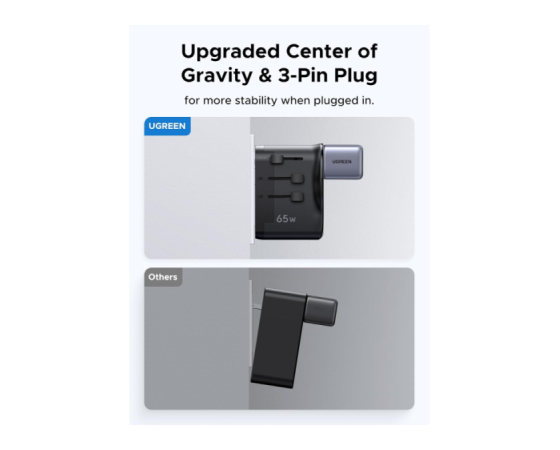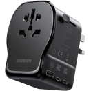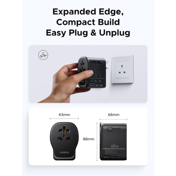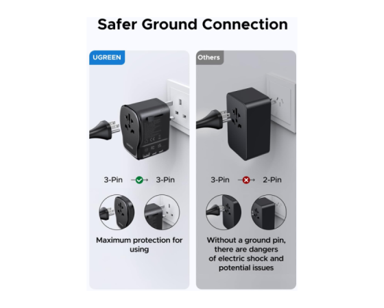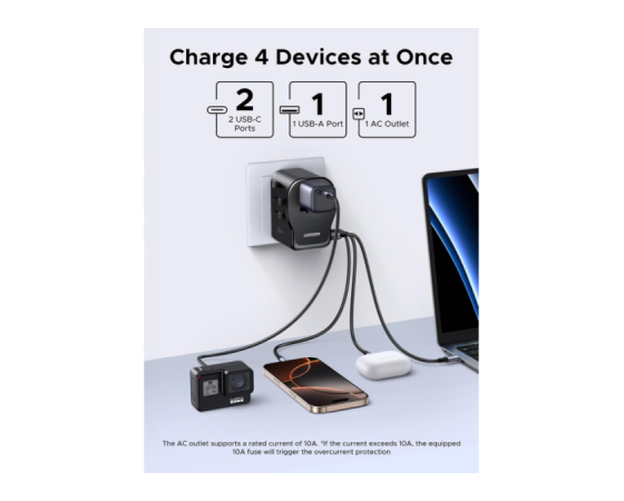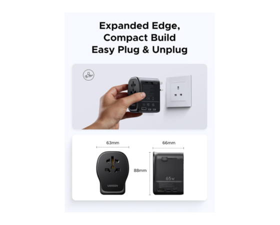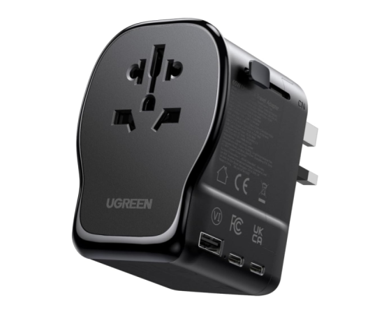 UGREEN 55001 (S550) je vsestranski univerzalni potovalni adapter z vgrajenim 65 W GaN polnilnikom, ki združuje kompaktno zasnovo, visoko moč in varnost. Opremljen je z dvema USB-C priključkoma, enim USB-A in univerzalno AC vtičnico, kar omogoča hkratno polnjenje več naprav kjerkoli na svetu.