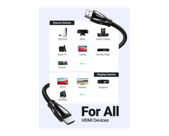 Ta kabel 8K HDMI je združljiv s PS5, PS4 Pro, PS3, Xbox 360, Xbox Series X, Xbox one X/S, Apple TV 4K, Roku, Nintendo Switch, Wii U, prenosnikom, osebnim računalnikom, Blu-ray predvajalnik, AV sprejemnik, TV palica, TV Box, DVD predvajalnik, Soundbar, Projektor, Monitor in več