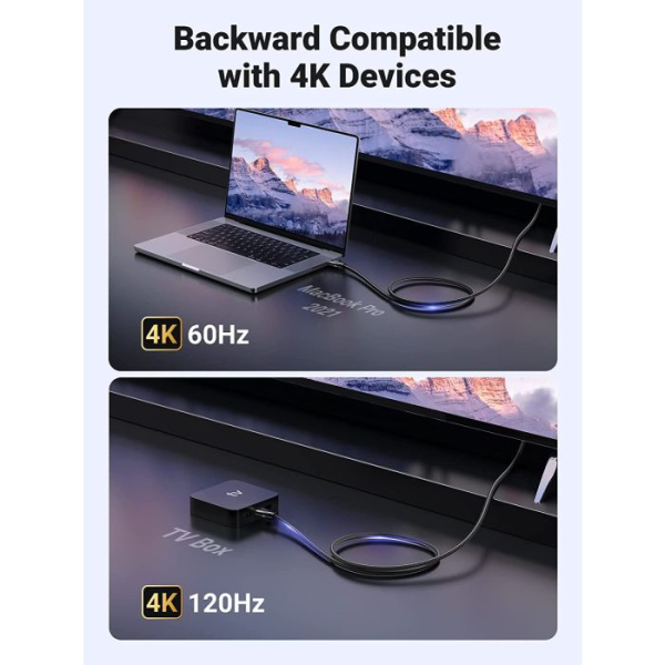 Prav tako je povratno združljiv z različicami HDMI 2.0b/2.0a/1.4/1.3/1.2/1.1, tako da bo še vedno deloval tudi z vsemi vašimi starimi napravami in pripravljen za prihodnje potrebe.