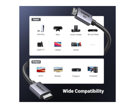 Združljivo z Apple TV/PS5/PS4 Pro/Roku Stick, Xbox Series X/S/Xbox 360, Nintendo Switch, Wii U, Mac mini M4/M4 Pro, prenosnim računalnikom, osebnim računalnikom, predvajalnikom Blu-ray, AV sprejemnikom, TV ključem, TV Boxom, DVD predvajalnikom, LG 8K UHD TV, Samsung G8/G9 QLED TV, Soundbar, Projektor, Monitor in več
