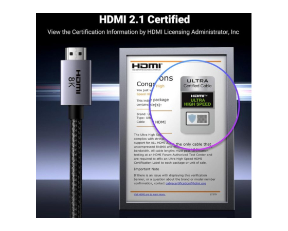 Kabli HDMI imajo certifikat HDMI 2.1. Kabel HDMI zagotavlja višjo ločljivost 10K 8K@60Hz in 4K@240Hz, kar je 4-krat več kot 4K@60Hz. Napredna tehnologija omogoča izjemno izboljšanje jasnosti in ostrine slike