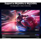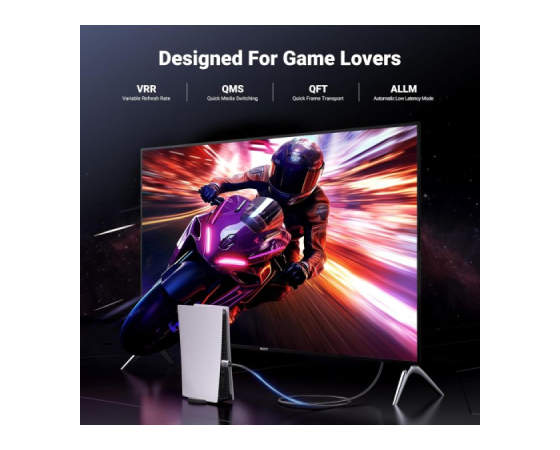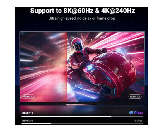Kabel HDMI 2.1 s pasovno širino 48 Gb/s zagotavlja nestisnjen 8K (7680 x 4320) video in hiter prenos brez izgube signala. Naj bo 2,6-krat hitrejši od HDMI 2.0 (18 Gbps). Kabel HDMI 4K@240Hz podpira tudi spremenljivo hitrost osveževanja in QFT za zmanjšanje "zakasnitve zaslona". Samodejni način nizke zakasnitve in hitro preklapljanje medijev za filme in video uporabljata mehanizem HDMI VRR za odpravo obdobja zatemnitve, ko naprava HDMI Source preklopi svoj video način