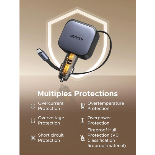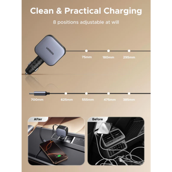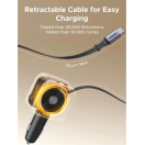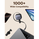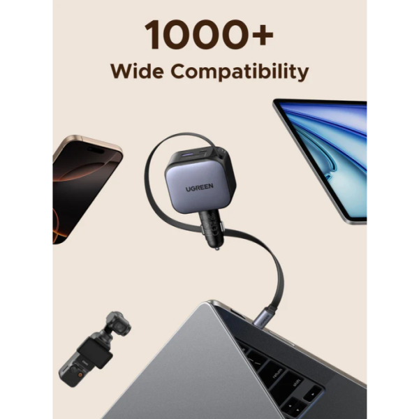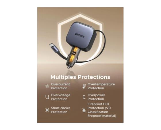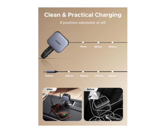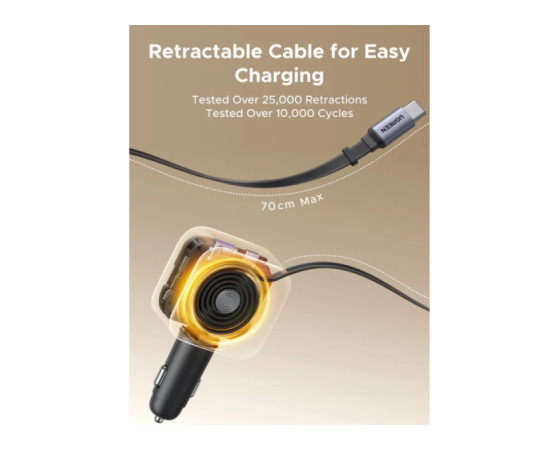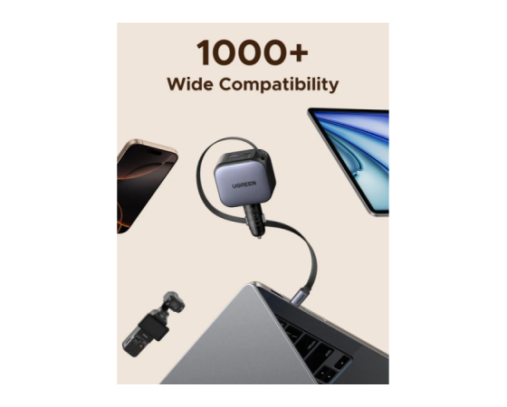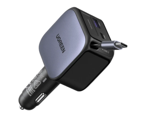 Ugreen Nexode 90W avto polnilec (model 55909B) je zmogljiv večnamenski polnilec za uporabo v vozilu, zasnovan za hitro in učinkovito polnjenje več naprav hkrati. Njegova glavna prednost je vgrajen izvlečni USB-C kabel, ki omogoča urejeno uporabo brez zapletenih kablov.