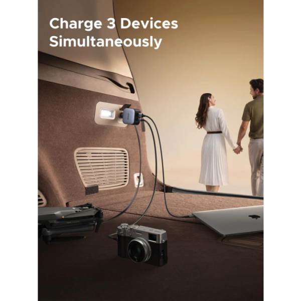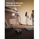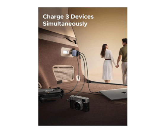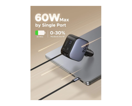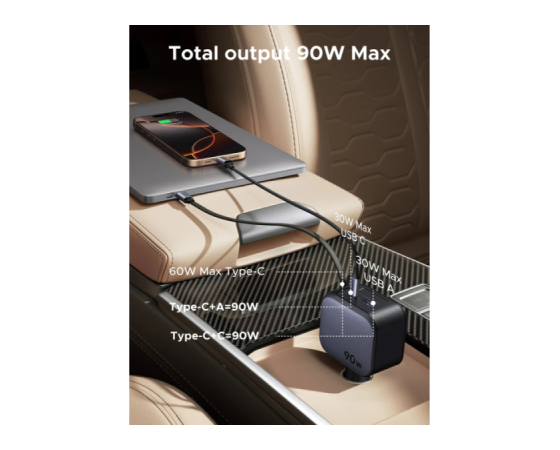 Polnilec omogoča skupno izhodno moč do 90 W, kar zadostuje tudi za polnjenje zahtevnejših naprav, kot so prenosniki, tablice in sodobni pametni telefoni. Vgrajen kabel podpira do 60 W, dodatna USB-C in USB-A vrata pa omogočajo istočasno polnjenje treh naprav.