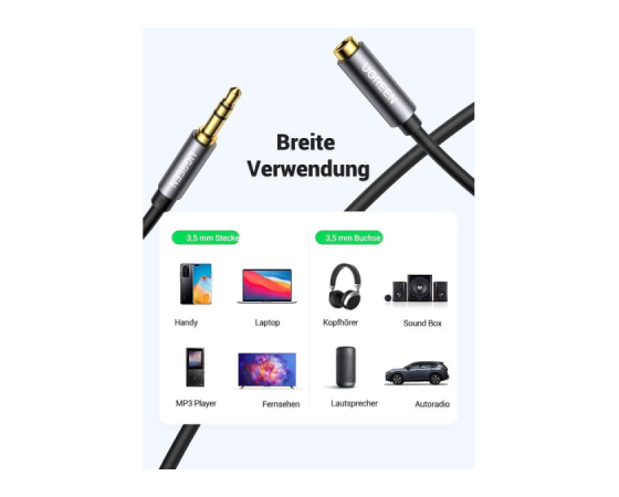 UGREEN Aux podaljšek je optimalna rešitev za podaljšanje Aux kablov in zaščito priključka avdio naprav.