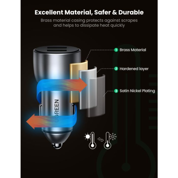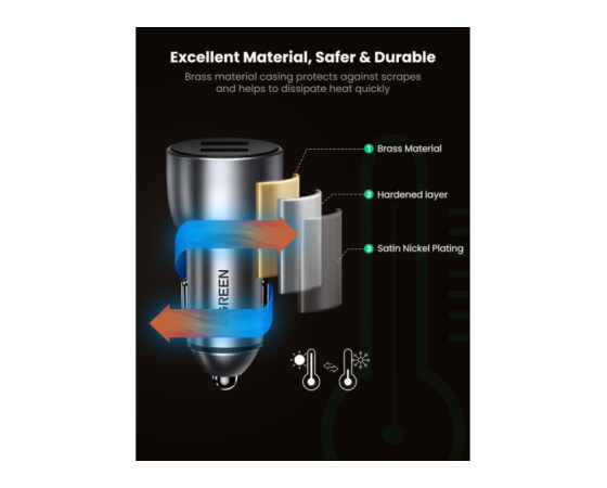 Medeninasto ohišje zagotavlja izjemno vzdržljivost adapterja, kompaktna oblika pa omogoča, da avtomobilski adapter vzame čim manj prostora.