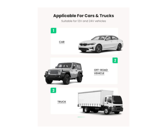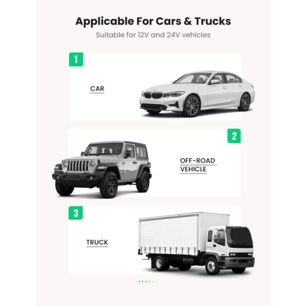 Uporaben je za napetosti 12V-24V tako, da polnilec deluje z avtomobili, tovornjaki, kombiji,..