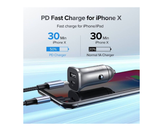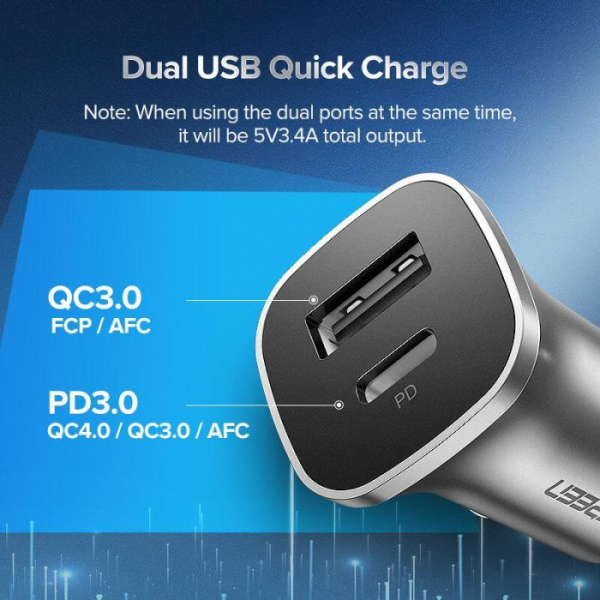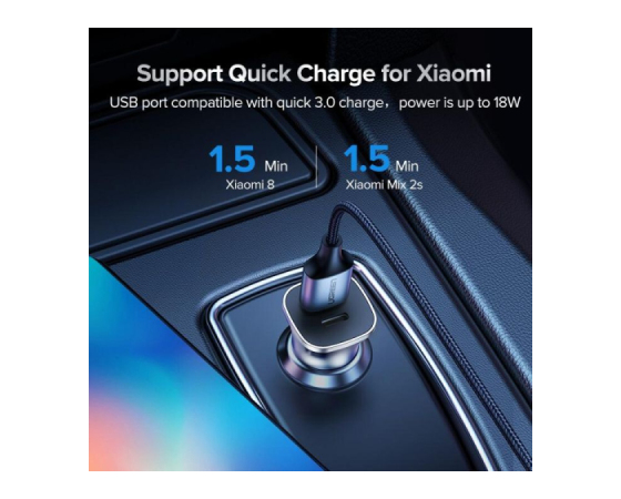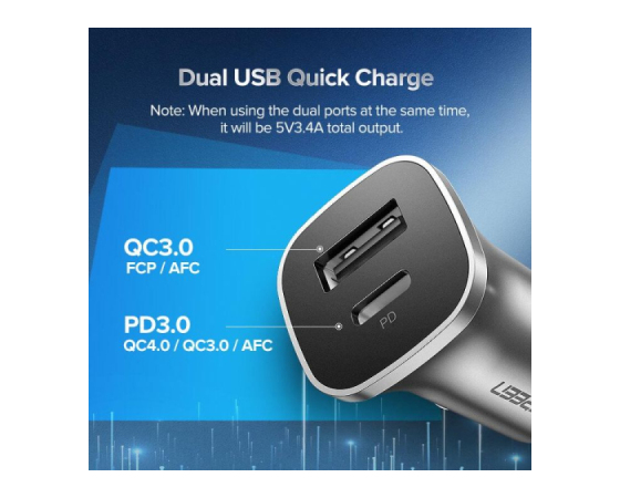 Ugreen avtopolnilec je idealen za vse, ki želite možnost hitrega polnjenje tudi v avtu. Na voljo imate dva izhoda USB A (QuickCharge 3.0) in USB-C, ki podpira tehnologijo polnjeja PowerDelivery PD 2.0 in QuickCharge 4.0/3.0.