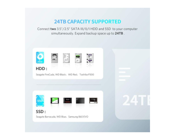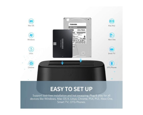 Podpora 2.5 '' / 3.5''SATA I / II / III trdega diska / SSD do 12TB Kot so WD, Seagate, - Toshiba Samsung Hitachi, Plug and play za vse računalniške sisteme, kot so Windows XP / Vista / 7/8 / 8.1 / 10 in Mac OS 10.4 do 10.13 in Linux.