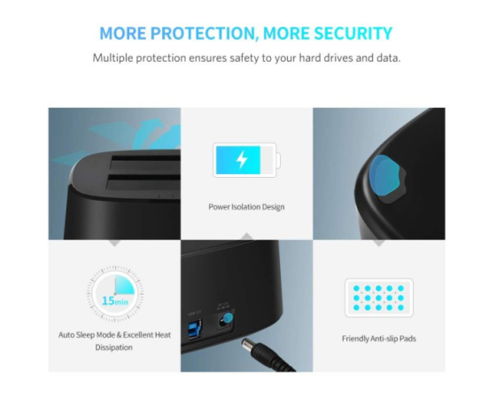 Ta priključna postaja je veliko varnejša od ohišja trdega diska ali kabla SATA. Priključna postaja je zasnovana tako, da bo vaš trdi disk učinkoviteje razpršil toploto in preprečil pregrevanje; Funkcija samodejnega spanja po približno 3 minutah podaljša življenjsko dobo vašega trdega diska.