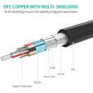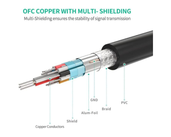 Trojni ščit s čisto bakreno žico, kar najbolj zmanjša zunanje motnje signala za prenos podatkov, pozlačeni konektorji z vrhunskim PVC-jem nudijo večjo vzdržljivost in fleksibilnost.